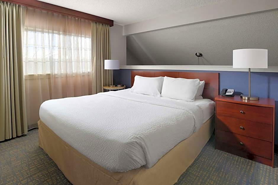This bi-level loft suite with a bedroom on the upper floor features a full kitchen. A seating area with a fireplace and satellite TV is also included.